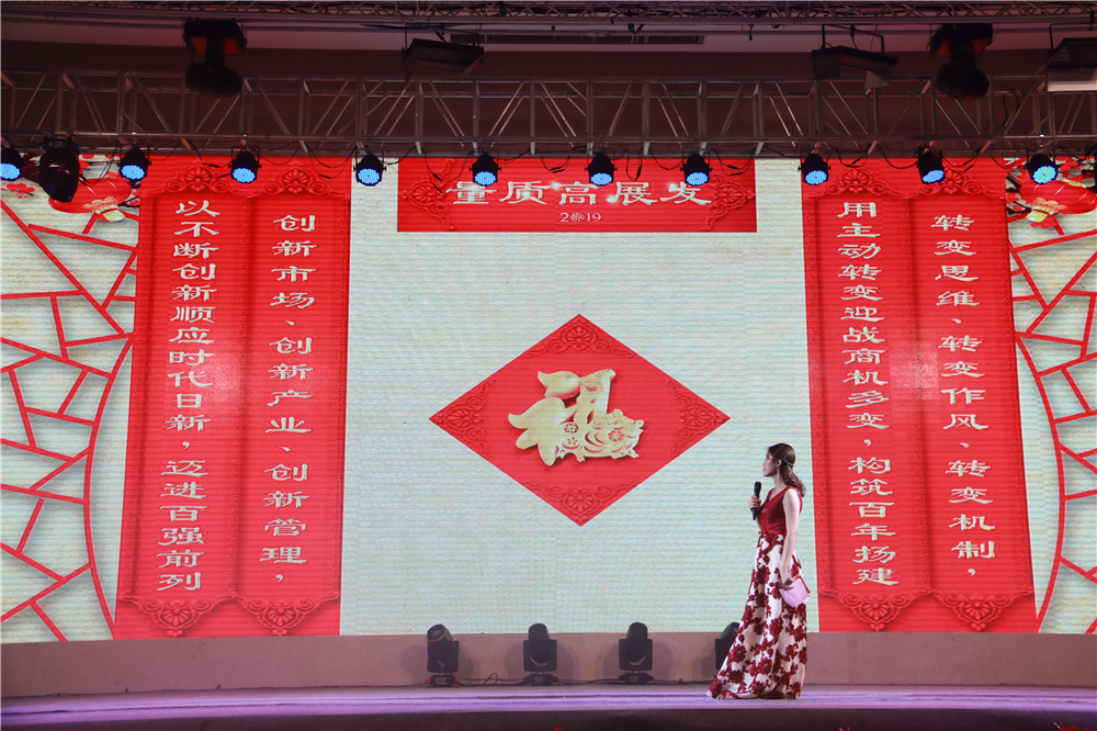 在總部員工表演的開(kāi)場(chǎng)舞《錦繡前程》節(jié)目之后,按照慣例繼續(xù)送出2019年的團(tuán)拜春聯(lián)。上聯(lián):轉(zhuǎn)變思維、轉(zhuǎn)變作風(fēng)、轉(zhuǎn)變機(jī)制,用主動(dòng)轉(zhuǎn)變迎戰(zhàn)商機(jī)多變,構(gòu)筑百年揚(yáng)建;下聯(lián):創(chuàng)新市場(chǎng)、創(chuàng)新產(chǎn)業(yè)、創(chuàng)新管理,以不斷創(chuàng)新順應(yīng)時(shí)代日新,邁進(jìn)百?gòu)?qiáng)前列;橫批:發(fā)展高質(zhì)量。