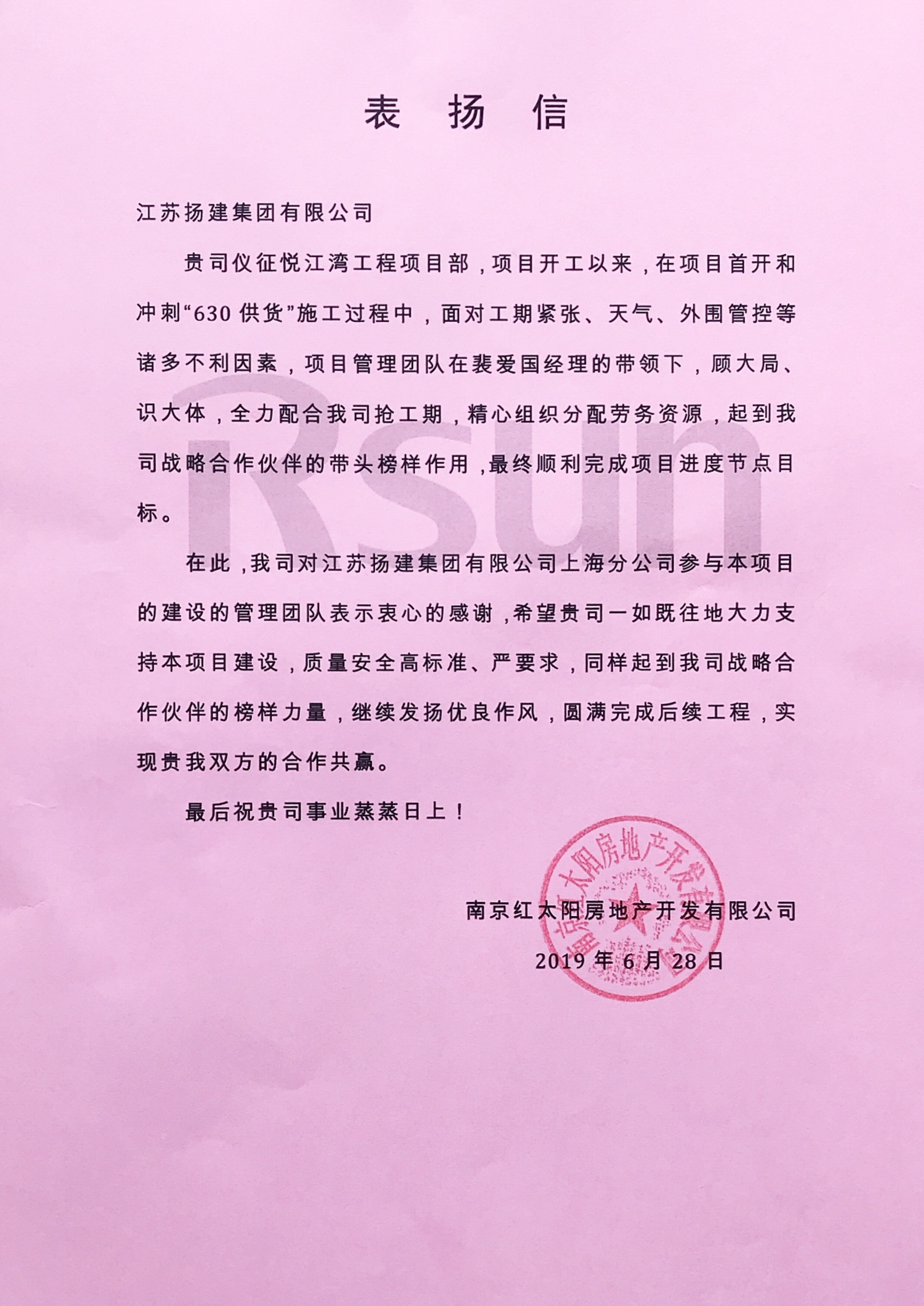四公司儀征悅江灣項(xiàng)目部受到業(yè)主表?yè)P(yáng)