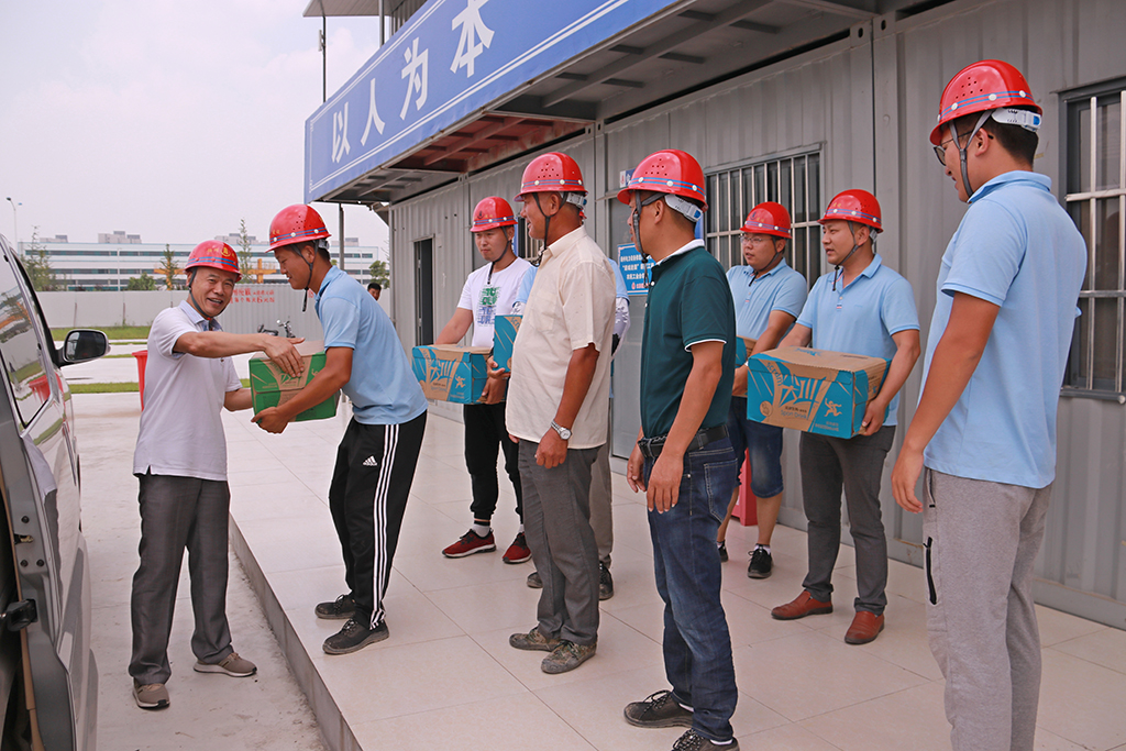 揚建網(wǎng)訊 近來,連續(xù)的高溫天氣驕陽似火地烤驗著揚州,也烤驗著我們堅守崗位的每一位員工。為切實做好項目一線防暑降溫工作,7月22日至26日,集團領(lǐng)導(dǎo)及集團工會、團委、人力資源部、安全部、總師辦等相關(guān)部門負責(zé)人先后赴揚子新苑D區(qū)安置房一期北組團項目工程、警示教育基地、湯汪污水處理廠三期擴工程、現(xiàn)代農(nóng)業(yè)科技創(chuàng)新中心產(chǎn)業(yè)化基地、廣沃電氣控制成套設(shè)備項目工程、公共衛(wèi)生中心、高郵人民醫(yī)院東區(qū)醫(yī)院(二期)、儀征2017-39#地塊、化學(xué)之光、沈飛601研究所項目、揚州軟件園南區(qū)工程、華晟新型建筑科技、無錫食品城工程項目部等近20個項目部進行夏季慰問,為冒著酷暑奮戰(zhàn)在一線的項目部管理人員、施工人員送去了飲料等消暑物品。
