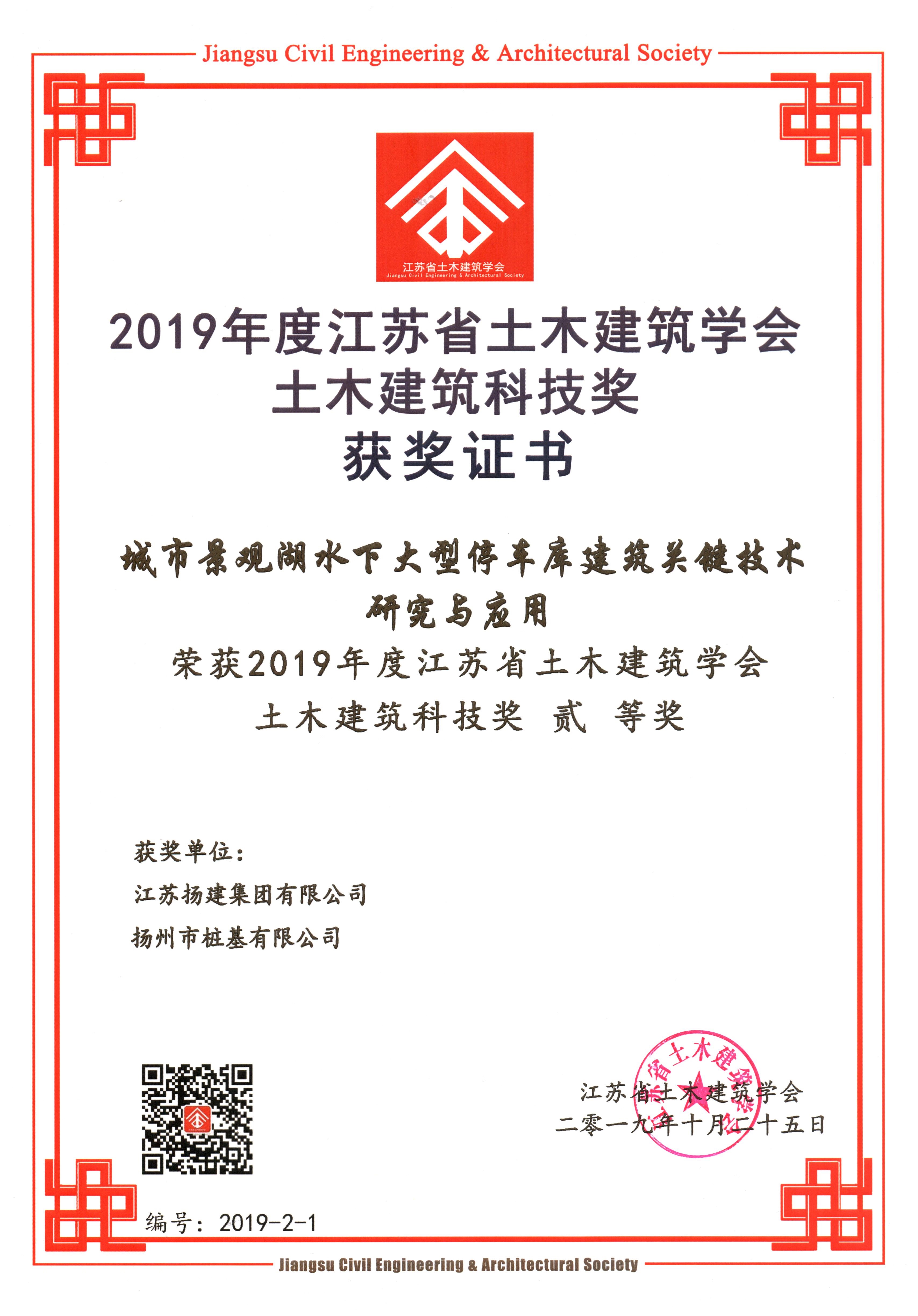 揚建網(wǎng)訊 11月24日,江蘇省土木建筑學(xué)會于南京頒發(fā)了2019年度江蘇省土木建筑學(xué)會·土木建筑科技獎。我集團申報的科技成果《城市景觀湖水下大型停車庫建筑關(guān)鍵技術(shù)研究與應(yīng)用》榮獲二等獎。