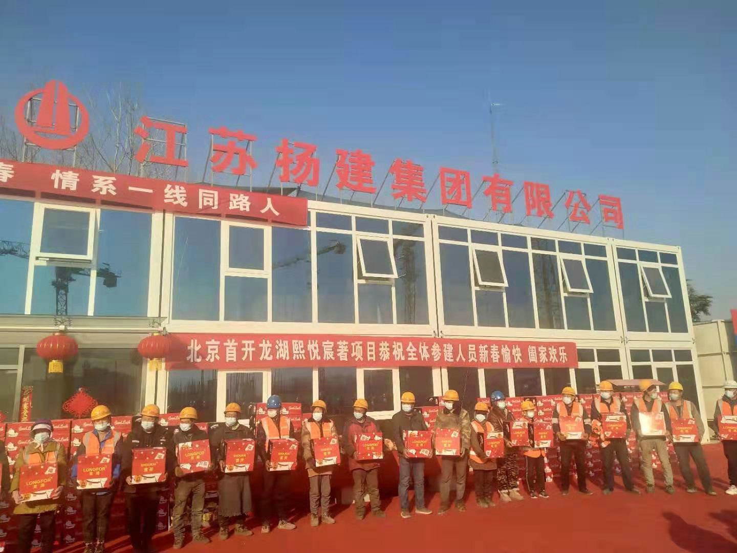 揚(yáng)建網(wǎng)訊 2月9日上午10時(shí)許,北京熙悅宸著項(xiàng)目業(yè)主龍湖地產(chǎn)集團(tuán)北京公司常務(wù)副總經(jīng)理陳明偉、副總經(jīng)理張長(zhǎng)明、首開(kāi)地產(chǎn)北京公司副總經(jīng)理李捷等一行冒著嚴(yán)寒、風(fēng)塵仆仆來(lái)到項(xiàng)目現(xiàn)場(chǎng),親切看望和慰問(wèn)就地過(guò)年的農(nóng)民工和項(xiàng)目管理人員,向奮戰(zhàn)在一線的400多名揚(yáng)建建設(shè)者致以誠(chéng)摯問(wèn)候和新春祝福,帶去了滿滿的春節(jié)“年貨”。集團(tuán)北方公司總經(jīng)理許世明、副總經(jīng)理吳勇陪同慰問(wèn)項(xiàng)目全體員工,并檢查項(xiàng)目部春節(jié)前各項(xiàng)工作。