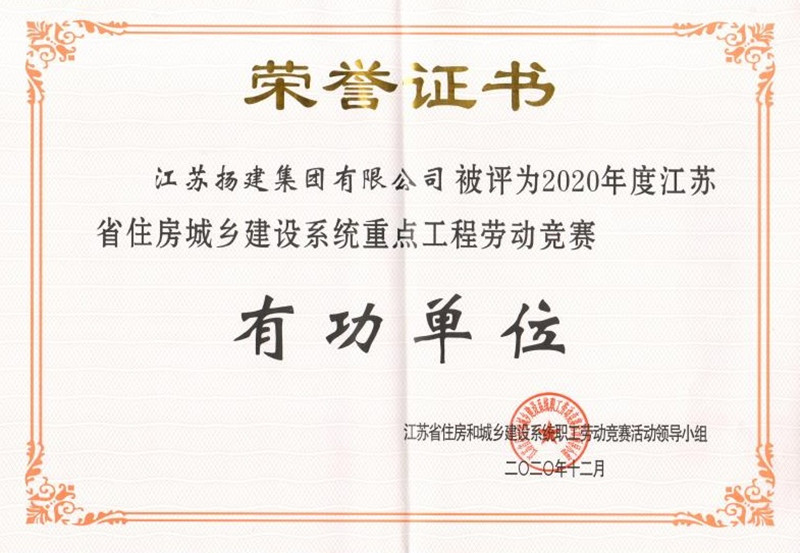 揚建網(wǎng)訊 2020年12月,為表彰先進,樹立榜樣,經(jīng)江蘇省住房和城鄉(xiāng)建設(shè)系統(tǒng)“安康杯”競賽領(lǐng)導(dǎo)小組研究決定,授予江蘇揚建集團有限公司2020年度江蘇省住房和城鄉(xiāng)建設(shè)系統(tǒng)“安康杯”競賽組織工作優(yōu)勝單位;經(jīng)江蘇省住房和城鄉(xiāng)建設(shè)系統(tǒng)職工勞動競賽活動領(lǐng)導(dǎo)小組研究決定,授予江蘇揚建集團有限公司2020年度江蘇省住房和城鄉(xiāng)建設(shè)系統(tǒng)重點工程勞動競賽有功單位榮譽稱號。