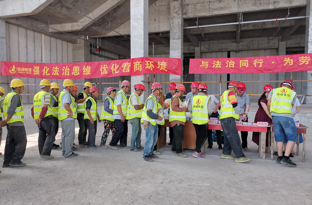 活動開始,市司法局領導詢問工人是否有法律方面的問題需要咨詢;并介紹了農民工兄弟維權合法渠道。接著,何平部長代表我集團對政府相關部門給予集團和農民工的關心關愛表示感謝,對辛勤奮斗在施工一線的工人兄弟表達了慰問?;顒又?,市相關部門領導給現場工人發(fā)放了《勞動法》《保障農民工工資支付條例》《工傷保險條例》《中國人民共和國民法典》等法律法規(guī)宣傳冊,并送去夏季防護用品,切實為工人謀實惠、辦實事,受到現場工人一致好評。