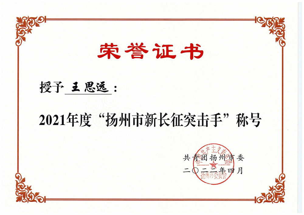 揚(yáng)建網(wǎng)訊 近日,團(tuán)市委表彰了一批先進(jìn)集團(tuán)和優(yōu)秀個人,揚(yáng)建集團(tuán)王思遠(yuǎn)同志榮獲2021年度揚(yáng)州市“新長征突擊手”稱號。