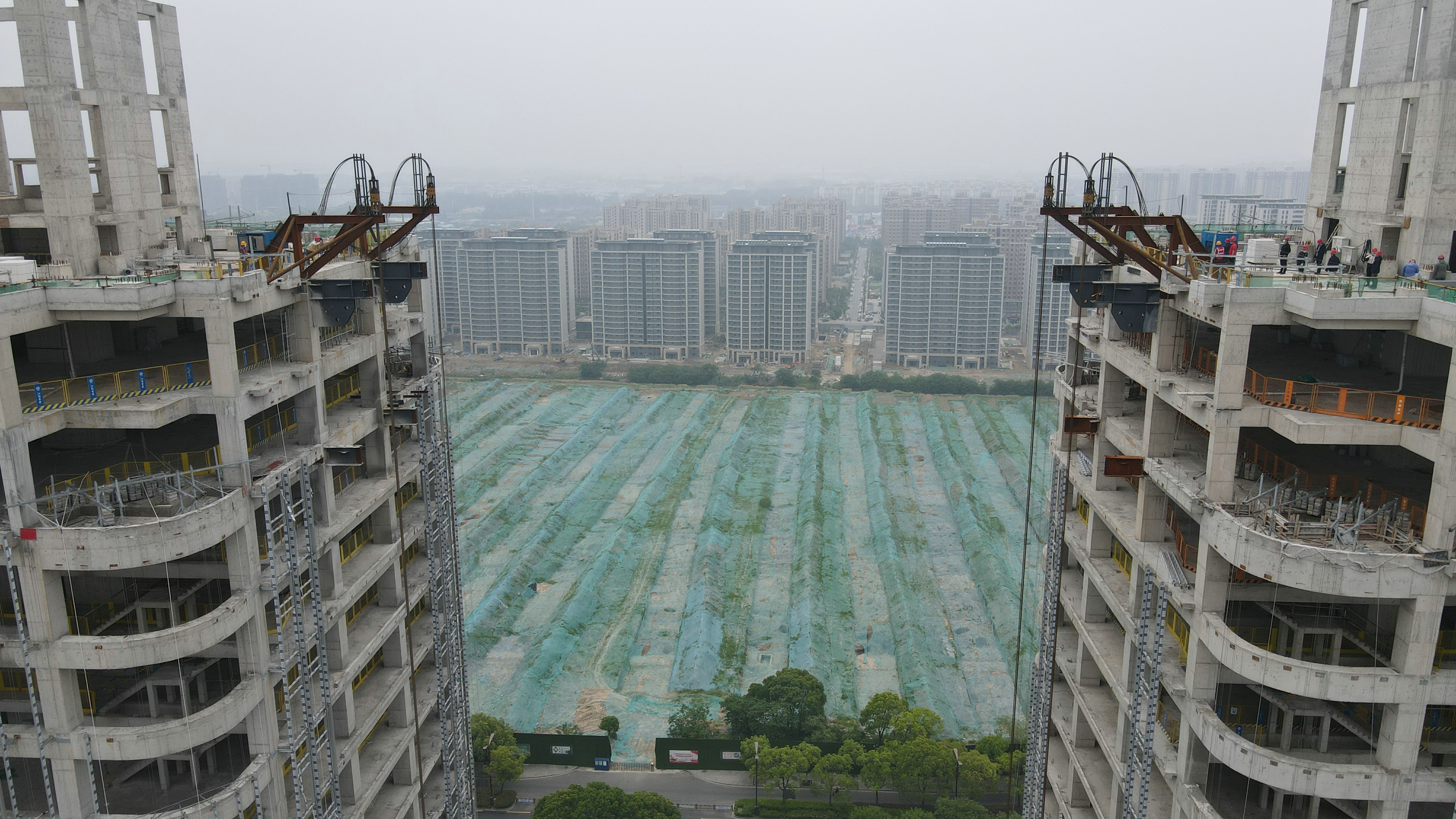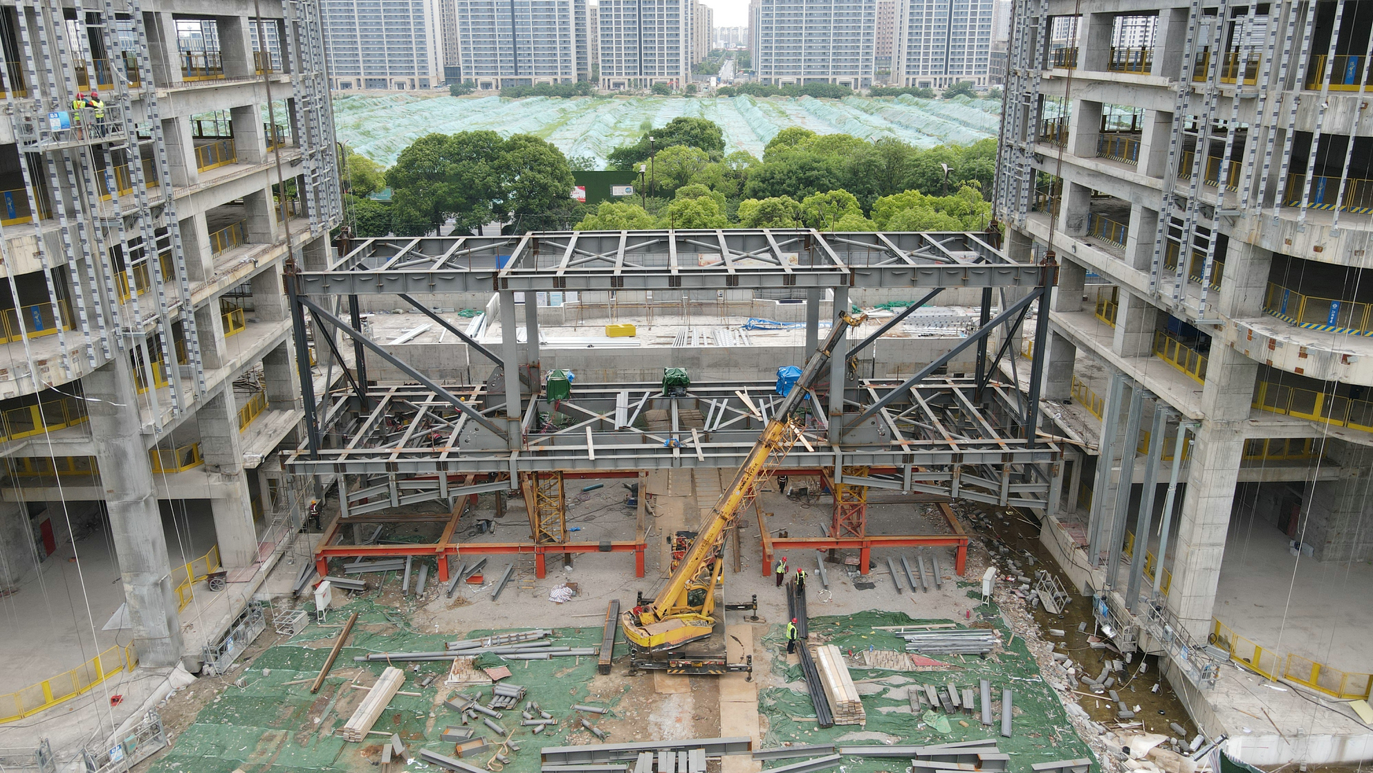 揚建網(wǎng)訊 5月13日上午9點整,跨度43.7m、重400噸,人稱蘇中高樓“第一跨”的揚州建工科技園A2、A3塔樓間的鋼結(jié)構(gòu)連廊提升施工,按照既定工期目標(biāo)正式啟動。