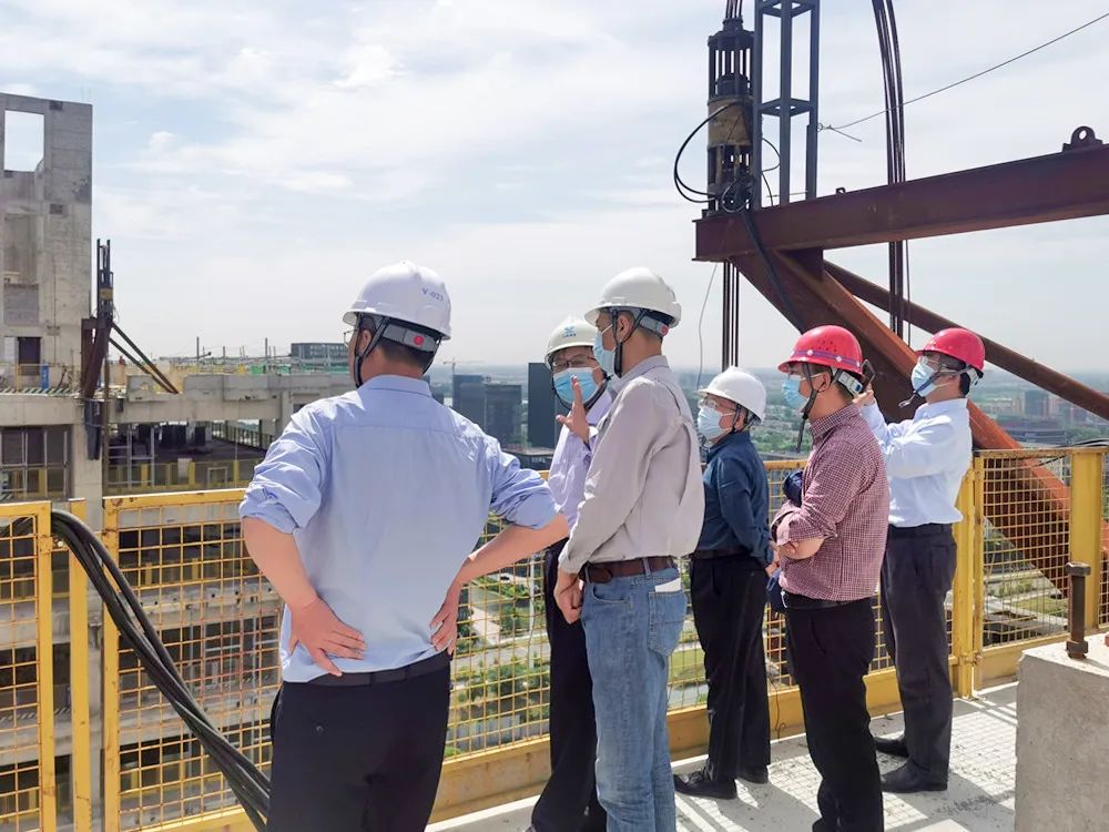 為確保鋼連廊的順利提升,施工期間,集團領(lǐng)導(dǎo)和技術(shù)部門多次來現(xiàn)場進(jìn)行工作指導(dǎo),邀請了東南大學(xué)郭正興教授來項目對鋼連廊提升的準(zhǔn)備工作進(jìn)行檢查和驗收。